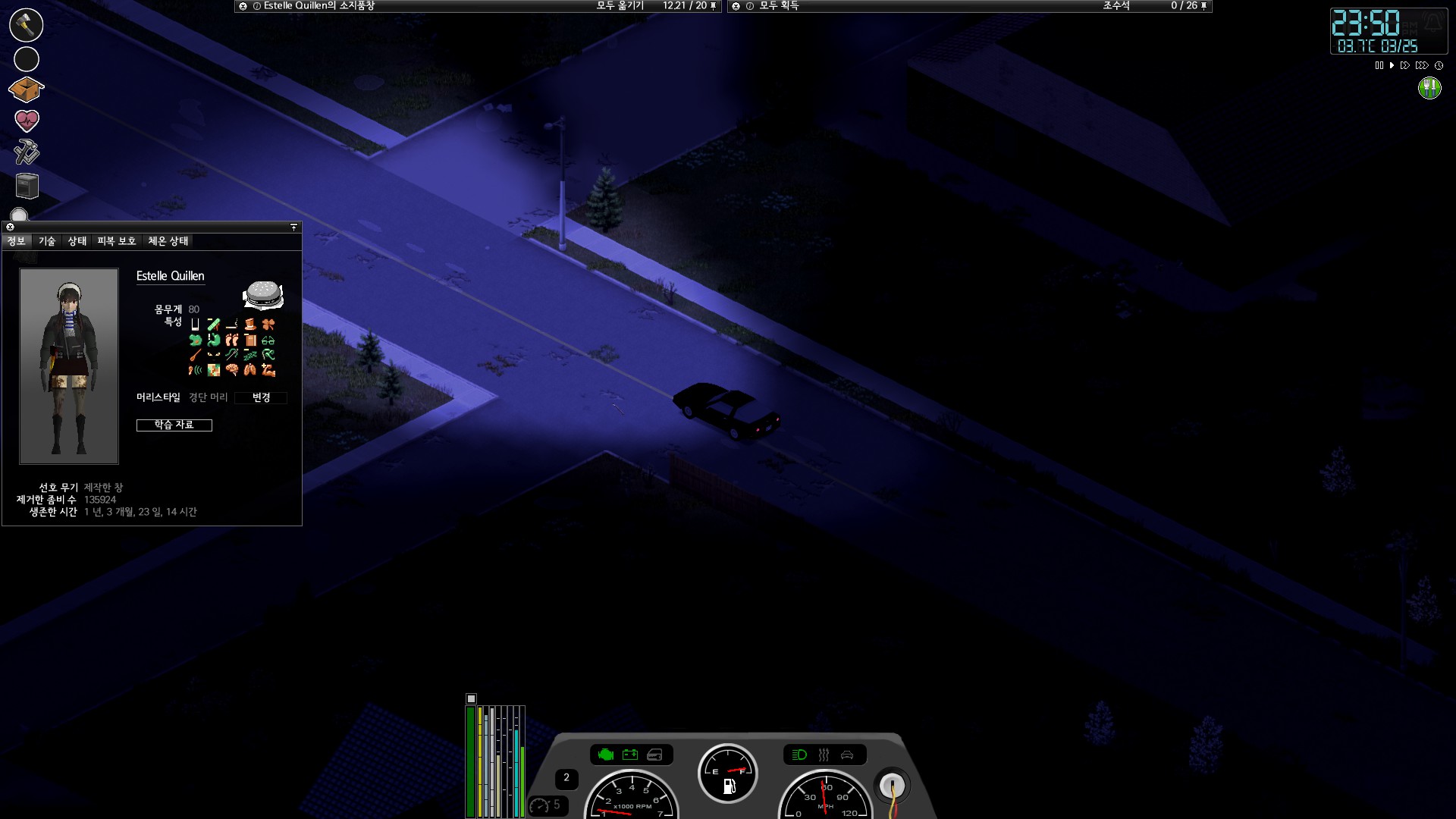 정화런을 하면서 되도록 지키려고 하는 원칙이 하나 있는데 그것은 "예쁘게 잡으려고 하지 말자"이다. 자동차로 지나갈 것을 생각하면 좀비를 길 가장자리로 몰아서 잡으려고 하게 되는데 그렇게 무리하게 플레이하다가 도리어 사고가 일어나는 경우가 많았기 때문이다. 여튼 그렇게 막 잡다보니 아파트 주변이 온통 좀비로 뒤덮여서 질병 무들이 너무 빠르게 뜨기 시작했다. 장소를 옮길 때가 된 것이다.